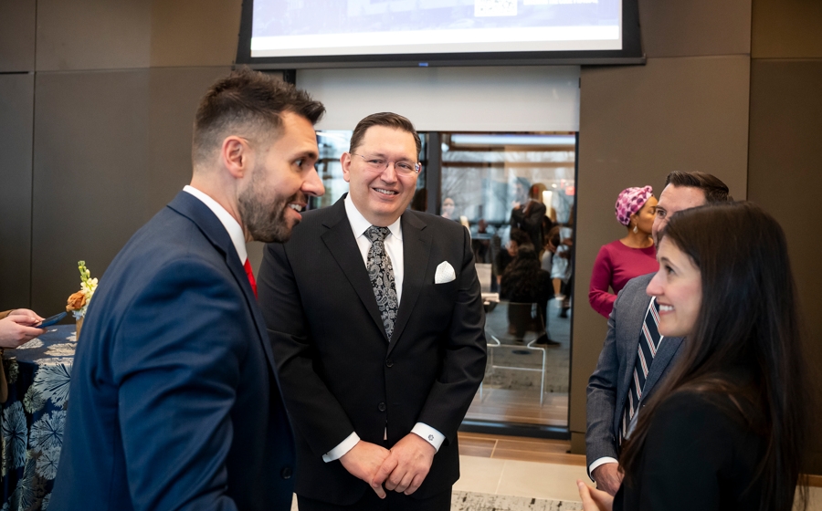 Nikki Ucheya, Health Policy & Management Marketing Specialist, chats with Assistant Professor Catherine Ettman and de Beaumont Foundation President Brian Castrucci.