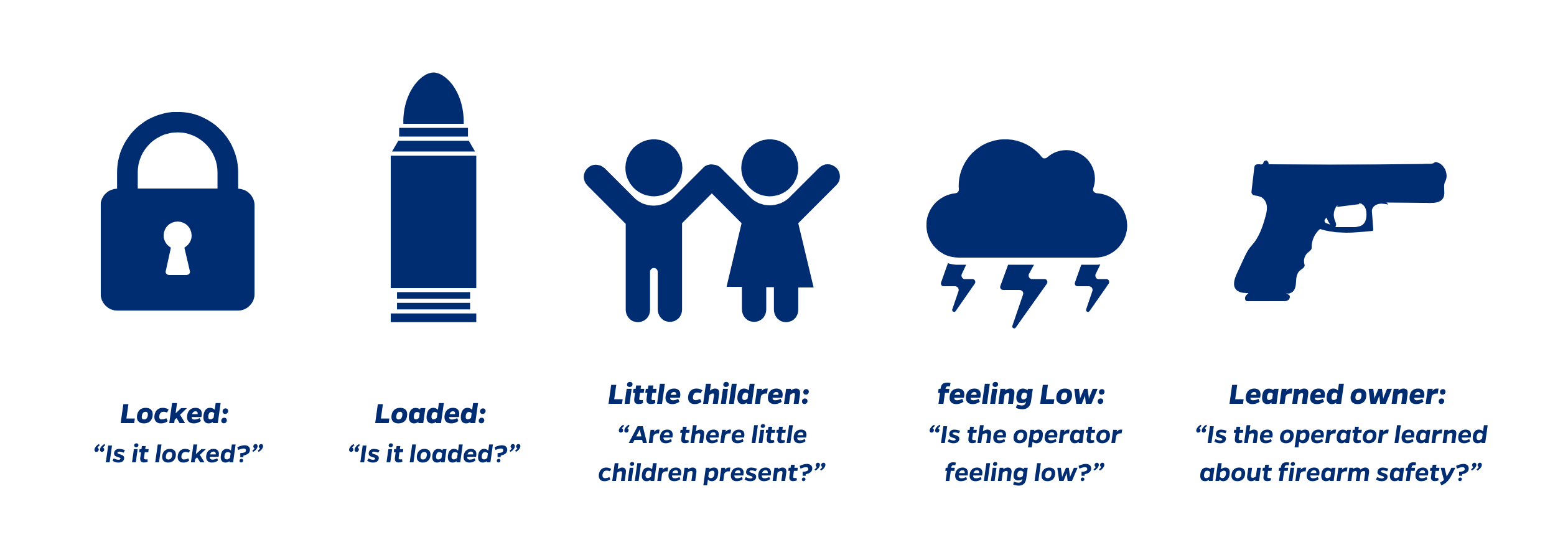The 5 Ls is a mnemonic to help guide health care clinicians in asking key questions and engaging in lethal means safety conversations about firearms storage in cases where their patient (or the patient’s parent/guardian) indicates that a firearm is in the home. The 5 Ls mnemonic was proposed in: Pinholt EM, Mitchell JD, Butler JH, & Kumar H. (2014). “Is there a gun in the home?” Assessing the risks of gun ownership in older adults. Journal of the American Geriatrics Society.