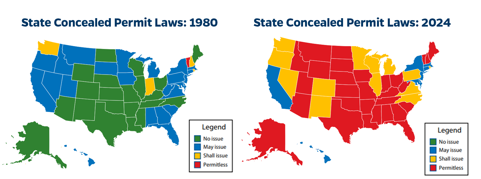 Over the last four decades, states across the country have weakened their concealed carry laws. In 1980, 19 states prohibited concealed carrying of firearms in public and 20 states issued permits only if the applicant demonstrated a good reason to concealed carry. Today, all 50 states allow for some form of concealed carry and in over half of U.S. states individuals can carry a loaded gun in some public places with no permit at all.