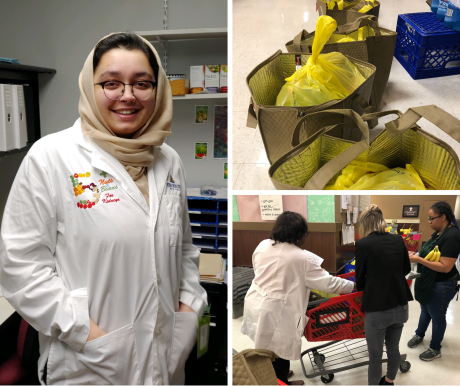 Our study team member (Tahiyat Sheikh) receives her first study lab coat with the beautiful 5 Plus study logo. (left) 5 Plus study staff (Erika and Debra Gayles) shopping and sorting groceries at ShopRite for dietary intervention participants. (bottom right)