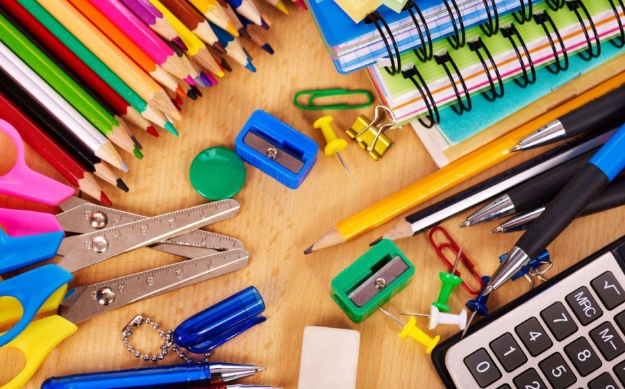 New and unopened supplies only including: pencils, pens, notebooks, paper, rulers, erasers, pencil sharpeners, highlighters and binders.