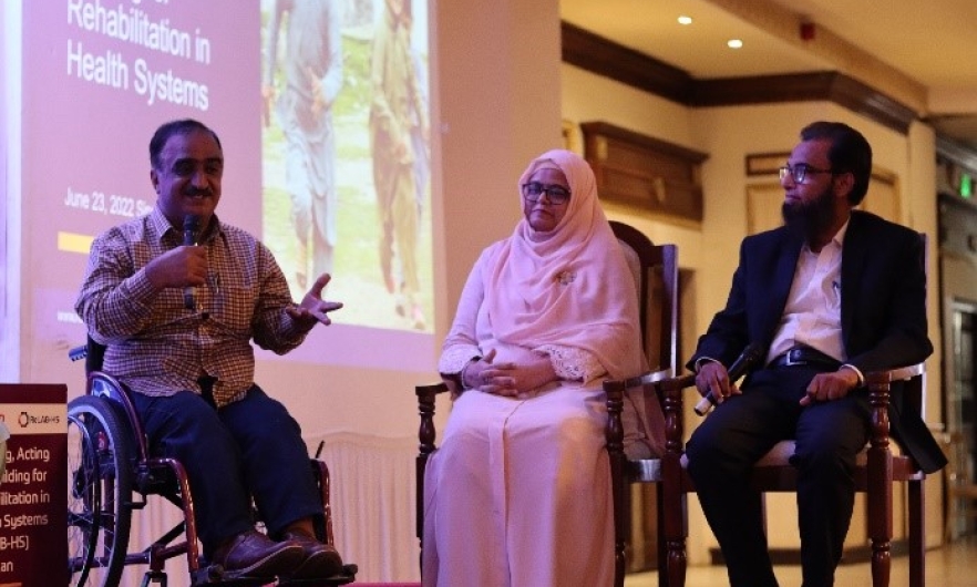 Javid Rais, (left) Disabled Welfare Association, speaks during a panel discussion at the ReLAB-HS launch in Karachi, Sindh. The two other panelists pictured are Dr. Sumaira Farooqui, professor at Principle College of Rehabilitation Sciences Ziauddin University Karachi and Dr. Syed Imran Ahmed, Sindh Institute of Physical Medicine and Rehabilitation deputy executive director.