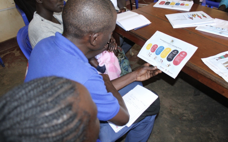 Ugandan collaborators critically assessing SBCC materials in pre-testing. Photo courtesy of Fredrick Echeku for ReLAB-HS.