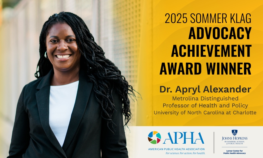 Apryl Alexander, PsyD, has been named the winner of the 2025 Sommer Klag Advocacy Achievement Award. Dr. Alexander, the Metrolina Distinguished Professor of Health and Policy in the Department of Health Management and Policy at the University of North Carolina at Charlotte, (UNC), earned the $30,000 award for her advocacy work on behalf of at-promise and systems-involved youth. The Advocacy Achievement Award is made possible through a gift from Helaine Lerner and her late husband, Sid Lerner. This award, administered by the Lerner Center for Public Health Advocacy at the Johns Hopkins Bloomberg School of Public Health in partnership with the American Public Health Association (APHA), intended to recognize the recipient’s contribution to the field of public health advocacy and support their continued advocacy efforts.