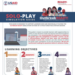 Before you begin Outbreak READY! as a solo player, we recommend downloading the Solo-Play Simulation Guide which provides learners with opportunities to reflect on key decisions made and lessons learned throughout the simulation.