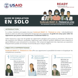 Avant de démarrer Outbreak READY 2 ! en tant que joueur solo, nous vous recommandons de télécharger le Guide de Simulation en Solo qui donne aux participants l’occasion de réfléchir aux principales décisions prises et aux leçons apprises tout au long de la simulation.
