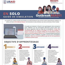 Outbreak READY ! est une simulation numérique en ligne destinée aux dirigeants et managers d'ONG de tous secteurs. Dans Outbreak READY ! , vous jouerez le rôle d’un chef d’équipe d’ONG gérant un portefeuille de programmes humanitaires multisectoriels pour une ONG internationale de taille moyenne nommée READY. La réponse a lieu dans un pays fictif à faible revenu qui a récemment connu un conflit civil à la suite d’une élection nationale contestée. La simulation est divisée en deux modules: le premier se concentre sur les priorités et les actions de préparation lorsqu’une épidémie est identifiée dans un pays voisin; le second se concentre sur la réponse de l’ONG à l’épidémie alors qu’elle commence à se propager. Au cours de la simulation, le participant doit prendre des décisions qui déterminent la manière dont l’ONG adapte et élargit les programmes pour répondre à l’épidémie.